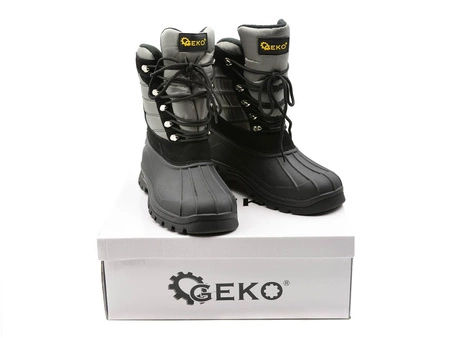 Wodoodporne buty „śniegowce” renomowanej marki GEKO. Dolna część cholewki oraz podeszwa wykonane zostały z wysokiej jakości termokauczuku charakteryzującego się bardzo dobrą przyczepnością, a dzięki dużej elastyczności przez co nie krępują ruchów oraz nie stawiają oporu podczas zginania.