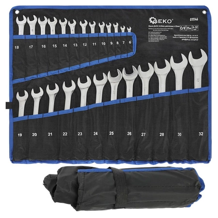 Zestaw kluczy płasko-oczkowych polerowanych 25-elementowy. Klucze wykonane są ze stali chromowo-wanadowej (CrV). Klucze umieszczono w wytrzymałej płachcie z zamykaniem na rzep oraz możliwością zawieszenia na ścianie.