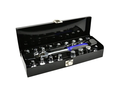Zestaw nasadek specjalistycznych przeznaczonych do odkręcania korków spustowych w miskach olejowych. W skład zestawu wchodzi 17 nasadek z gniazdem 3/8” oraz pokrętło z przegubem 3/8”. Wszystkie elementy zestawu wykonane zostały z wytrzymałej stali narzędziowej CrV.