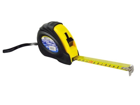 Profesjonalna miara, taśma zwijana stalowa z podwójną blokadą. Taśma o długości 10 m i szerokości 25 mm.