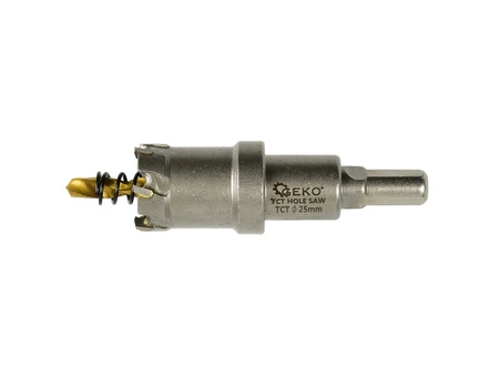 Otwornica TCT do metalu w rozmiarze 25mm. Ostrza wykonane z węglików spiekanych, które charakteryzują się znacznie większą twardością oraz odpornością na wysokie temperatury w porównaniu do stali szybkotnącej HSS. Przeznaczona do wykonywania większej średnicy otworów w stali, żeliwie, metalach kolorowych, drewnie, tworzywach sztucznych itp. Dla zwiększenia precyzji cięcia zastosowano wiertło prowadzące ze stali HSS. Sprężyna zamocowana na wiertle prowadzącym, pozwala w łatwy sposób usunąć urobek.