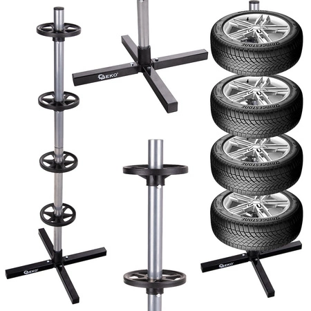 - Trzymanie Kół: Stojak posiada możliwość trzymania 2 lub 4 kół, co czyni go idealnym rozwiązaniem do przechowywania zestawów kół zimowych, letnich lub zapasowych, zapewniając porządek i oszczędzając miejsce w garażu lub warsztacie.