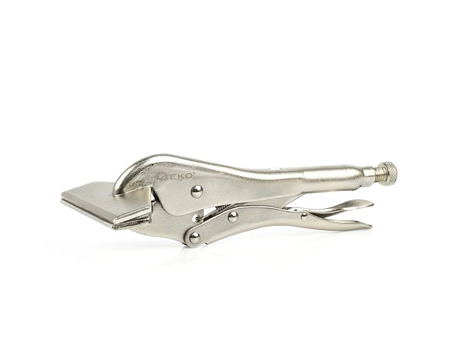 Szczypce zaciskowe spawalnicze płakie. Doskonale sprawdzą się w profesjonalnych zakładach spawalniczych. Dolna regulowana samozaciskowa szczęka umożliwia mocne zaciśnięcie szczęk na wybranym elemencie, zapobiegając jego ślizganiu i przemieszczaniu.