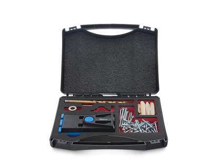 Kompletny zestaw do wykonywania połączeń niewidocznych przy użyciu wkrętów do drewna. Dzięki zestawowi marki Geko w 3 krokach wykonasz precyzyjne i stabilne połączenie ukryte. Głównym elementem zestawu jest szablon przeznaczony do wykonywania precyzyjnych otwórów pod odpowiednim kątem. Następnym krokiem po wykonaniu otworów jest połączenie ze sobą dwóch drewnianych elementów przy pomocy dołączonych do zestawu wkrętów o różnej długości. Ostatnim etapem pracy jest zamaskowanie otworów specjalnymi kołkami skośnymi, a następnie docięcie kołów i wyszlifowanie powierzchni.