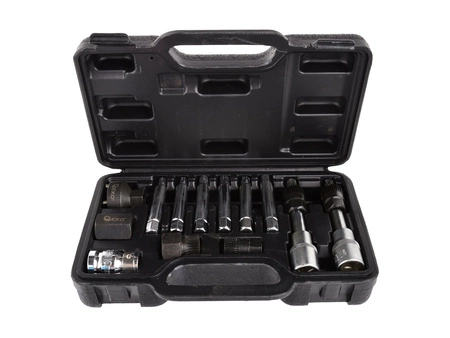 Zestaw kluczy do montażu i demontażu alternatorów. Klucze wykonane zostały z wysokogatunkowej stali chromowo-wanadowej CrV, dzięki czemu są wytrzymałe i odporne na uszkodzenia. Klucze umożliwiają jednoczesne odkręcanie śruby mocującej koło pasowe (za pomocą odpowiedniego bitu) oraz przytrzymywanie koła ze sprzęgłem (za pomocą specjalistycznej nasadki).