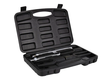 Zestaw ściągaczy widełkowych do drążków kierowniczych i sworzni kulkowych wykonany ze stali chromowo-wanadowej (CrV). Zestaw zawiera trzy ściągacze widełkowe o szerokości wewnętrznej 28, 24, 17 mm oraz dwie rękojeści do dociskania, przystosowane do pracy z młotkiem pneumatycznym lub ręcznym. Ramiona widełek ściągacza posiadają trwałe i równe powierzchnie klinowe pozwalające na łatwe i precyzyjne umocnienie sworzni kulkowych oraz drążków kierowniczych.