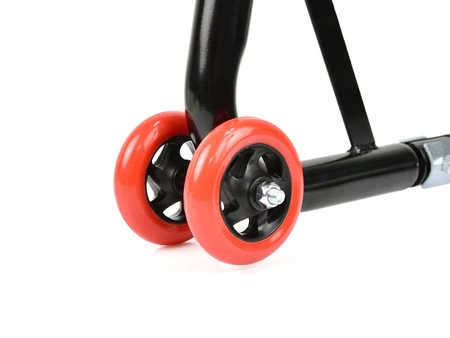 Wzmacniany stojak motocyklowy pod przednią i tylną oś. Do produkcji wykorzystano stalową rurę o średnicy 32 mm malowaną proszkowo. Dodatkowo, wzmacniana konstrukcja stojaka gwarantuje stabilne i bezpieczne podnoszenie motocykla. Kółka wykonano z wysokiej jakości tworzywa ABS.