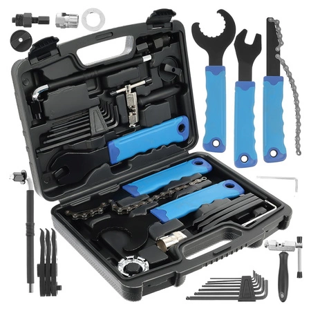 Zestaw narzędzi przeznaczonych do naprawy oraz konserwacji rowerów. Zestaw niezwykle przydatny dla każdego amatora kolarstwa, doskonale sprawdzi się również w profesjonalnym serwisie rowerowym. Zestaw składa się z 20 elementów umożliwiających naprawie większości usterek. Całość zapakowana w poręczną walizkę z wytrzymałego tworzywa sztucznego.