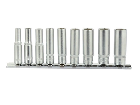 Zestaw nasadek długich 6-kątnych. W komplecie znajduje się 9 nasadek w rozmiarach 5 - 13 mm z mocowaniem 1/4". Całość wykonano z wytrzymałej stali stopowej chromowo-wanadowej.