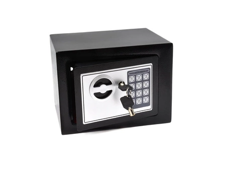 Mały, solidnie wykonany sejf z elektronicznym zamkiem na kod cyfrowy.
