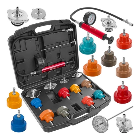 Tester służy do lokalizowania nieszczelności w układzie chłodzenia. Wytrzymała pompa ręczna o płynnym działaniu i łatwą do odczytania skalą manometru. W zestawie znajduje się ponadto 12 adapterów do różnych marek samochodów oraz termometr.
