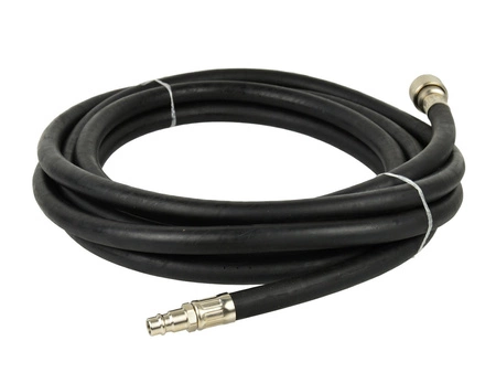 Profesjonalny pneumatyczny przewód gumowy o długości 5 metrów. Przewód wykonano z gumy odpornej na olej oraz ścieranie. Elastyczna guma zapobiega trwałym odkształceniom. Przewód jest kompletny, okuty w standardowe szybkozłącze i wtyczkę.