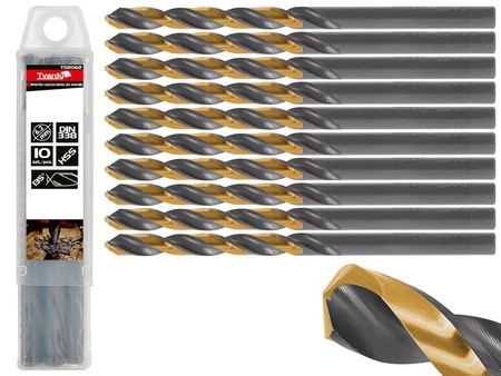 Wiertła do metalu złoto-czarne wykonane ze stali szybkotnącej 4341 HSS, pokryte powłoką TiN (azotek tytanu). Wiertła zgodne z normą DIN 338. Uchwyt cylindryczny.