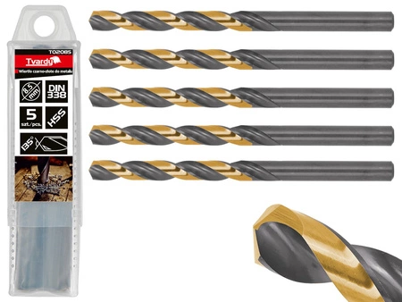Wiertła do metalu złoto-czarne wykonane ze stali szybkotnącej 4341 HSS, pokryte powłoką TiN (azotek tytanu). Wiertła zgodne z normą DIN 338. Uchwyt cylindryczny.