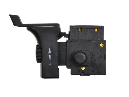 Przełącznik wciskany, z regulacją prędkości obrotowej, zmianą kierunku obrotów prawo/lewo oraz blokadą przełącznika w pozycji włączonej na stałe.