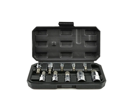 Zestaw nasadek trzpieniowych spline w rozmiarach M4-M18 10 szt. Wykonane zostały z wytrzymałej stali narzędziowej CrV. W zestawie znajdują się nasadki trzpieniowe z gniazdem 1/4”, 3/8”, 1/2”.