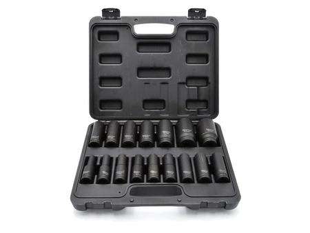 Zestaw nasadek udarowych długich (78mm) 1/2". W zestawie 16 nasadek zapakowanych w walizkę z tworzywa sztucznego.