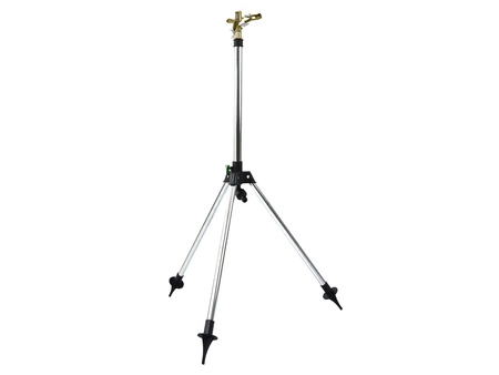 Solidny zraszacz pulsacyjny, wykonany w całości z aluminium, stali i mosiądzu. Zamontowany na statywie z możliwością regulowania wysokości od 57 cm do 90 cm. Średnica zraszania wynosi maksymalnie 24 m, w zależności od ciśnienia strumienia wody. Stabilny aluminiowy stojak posiada wyprofilowane kolce, które zapewniają stabilność zraszacza na miękkim i nierównym podłożu.Zraszacz wyposażony w adapter pozwalający na podłączenie węża za pomocą szybkozłączki w szybki i łatwy sposób. Powierzchnia nawadniania od 30 do 360 ° regulowana za pomocą dwóch metalowych pierścieni. Wyjątkową zaletą tego zraszacza jest cicha praca i efektywny strumień wody. Regulowany strumień wody w zależności od potrzeb - od strumienia do rozproszonej mgiełki.
